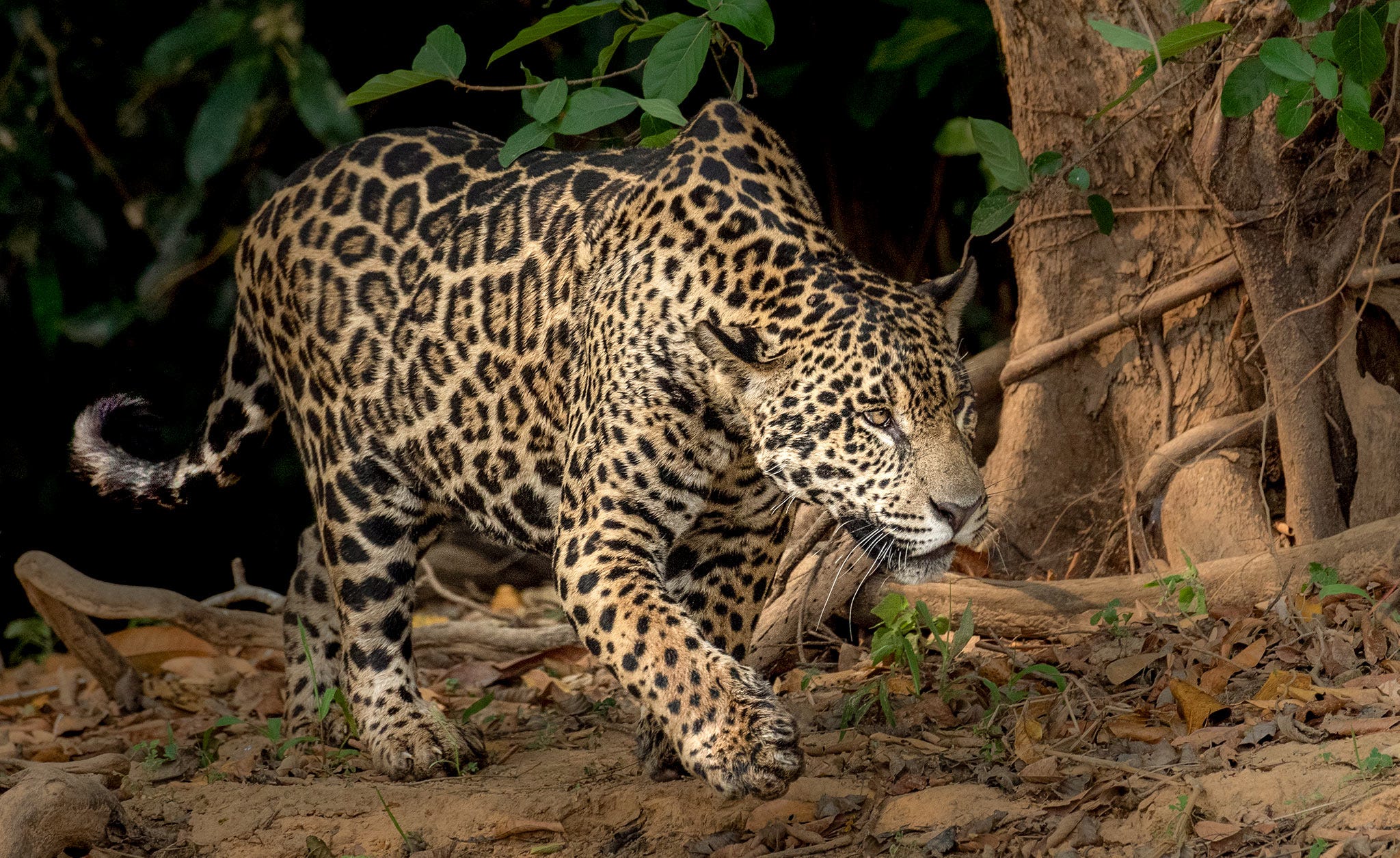 "It was a winter morning in the Pantanal," Karen remembers "and it was warm with no clouds in the sky as winter is the dry season. Suddenly we spotted this jaguar walking along a pathway. We were in our boat and I just took many photos. I particularly like this one with the paw slightly bowing out, the claws very apparent".