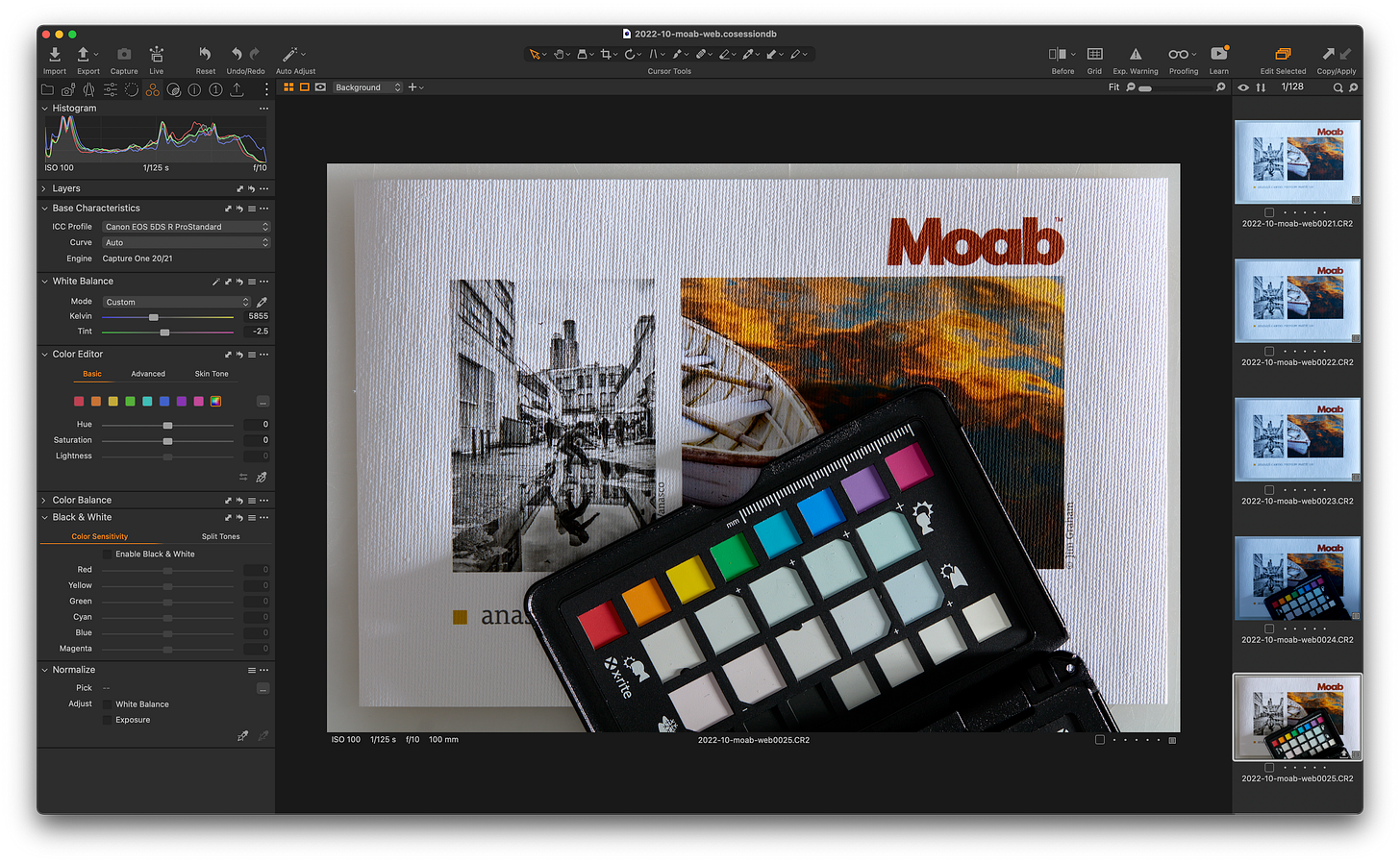 The image at the top shows a fairly simple setup. This should be a piece of cake right? My camera is mounted pointing down on a C-stand, I’ve got a neutral (white) cutting mat as a background, a print on a white (neutral) canvas, and an X-Rite color checker for calibration.