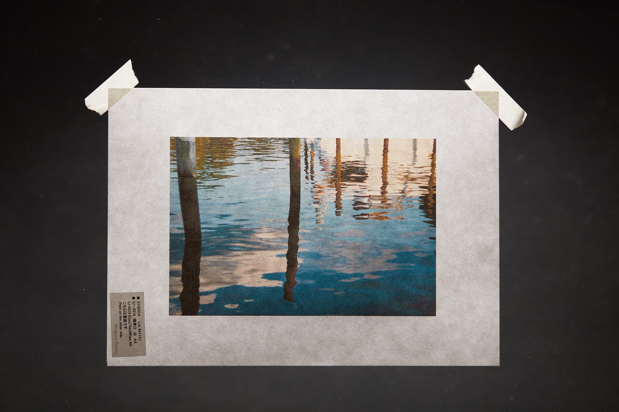 I could simulate that with another flash head here but I was too lazy and perfecting a product illustration was not my point. The real job here is starting to experiment with various, attractive methods of mounting the thin varieties of Awagami papers that subtly but explicitly show their translucent quality along with the nature of the materials used in making the paper.