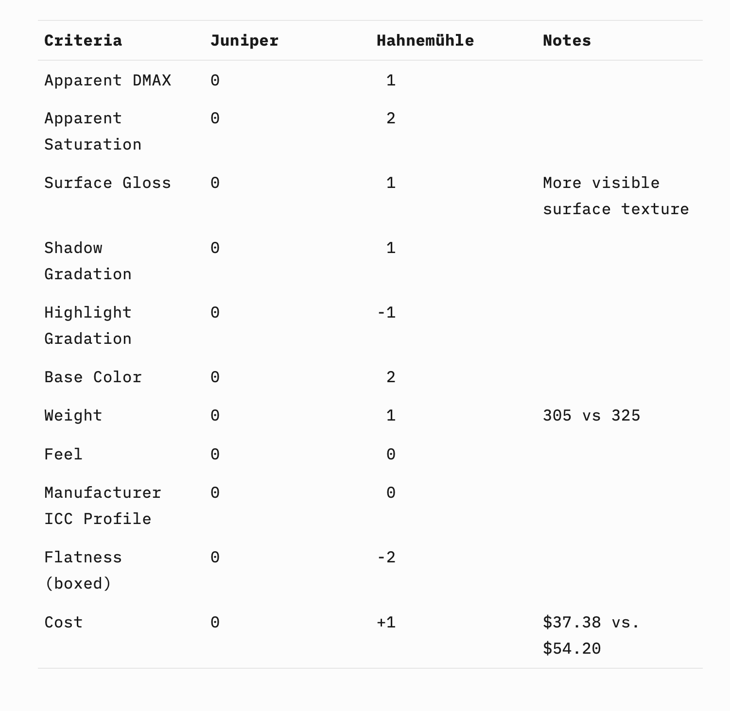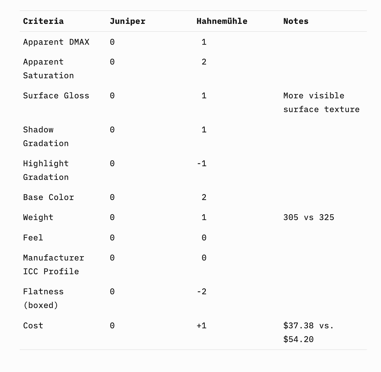 We didn’t develop or perform technical metrics as those typically don’t translate to what a print will look like. Instead we developed a list of visual criteria that most of us would consider when critically viewing two otherwise identical prints side-by-side. We also threw in a few practical criteria when using the papers. Here’s the criteria we settled on: