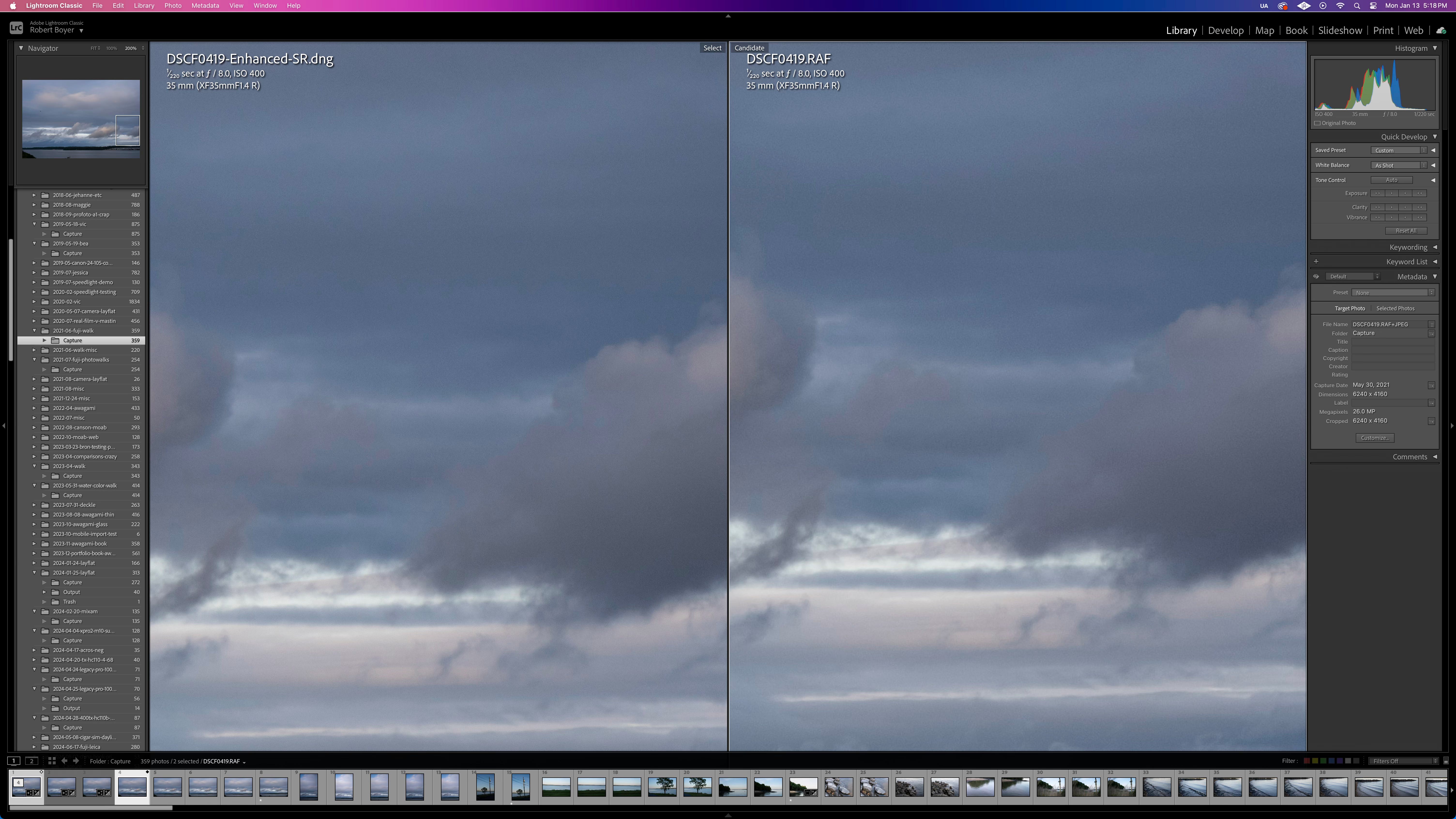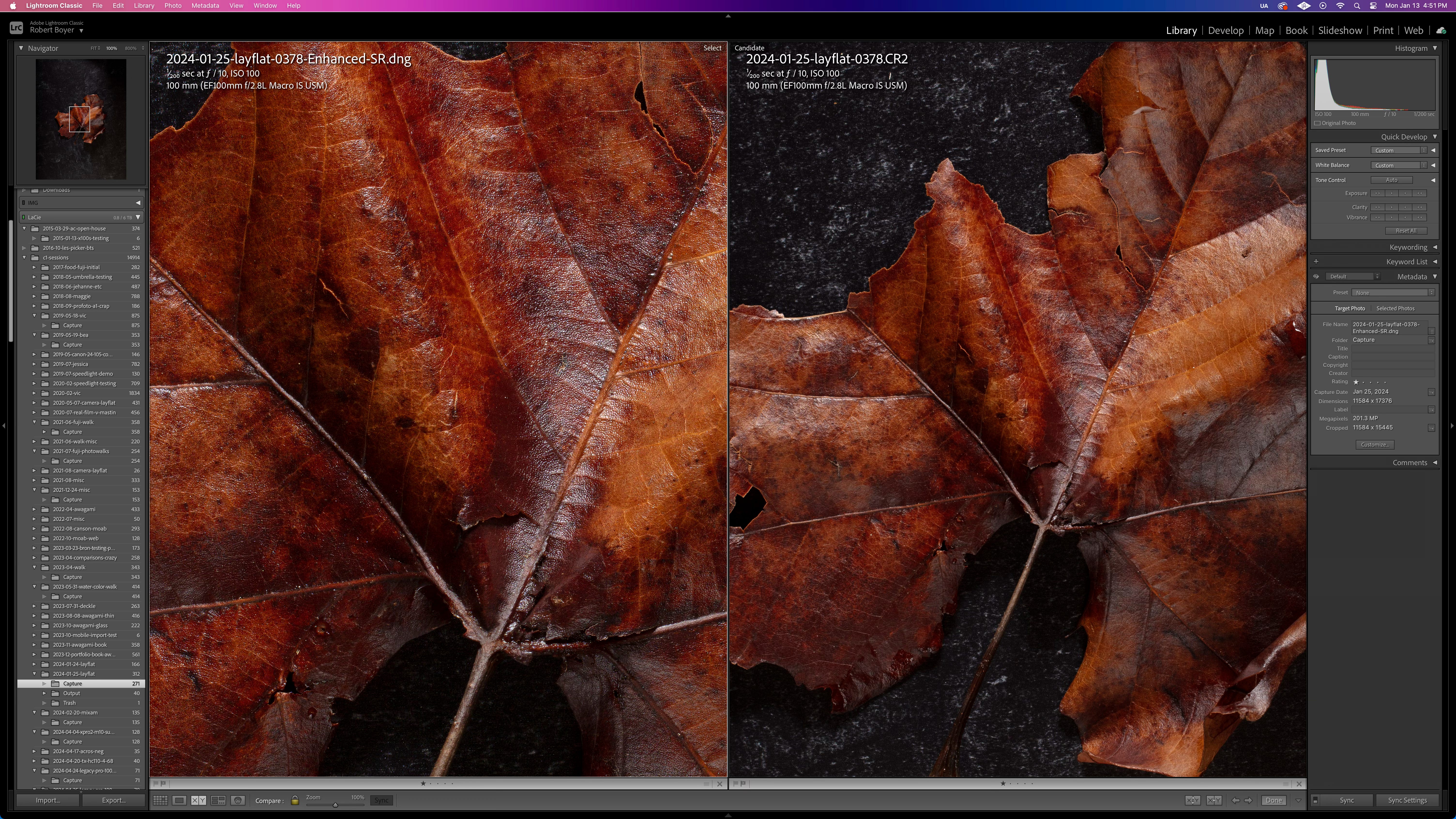 Let’s call it two and a half great new Lightroom Classic features for anyone that makes large prints or depends on zero-noise images. RAW Details seems to be built to use with Denoise. I have far more testing and experience to gain to see if there is a case to be made for using RAW Details on its own. Suuuuper Resolution is a winner. The curious thing is that you cannot use Super Resolution directly on a DNG file produced by RAW Details or Denoise. Why not? Is it because RAW Details and Denoise are baked into Super Resolution. From cursory analysis the answer is it does not look like they are baked in, at least not completely but the noise does seem to be a lot less prominent in the Super Resolution DNG than the original RAW at 200% so maybe some form of those are applied? Of course you can work around that by exporting the Super Resolution DNG to a TIFF and then running Denoise on that.