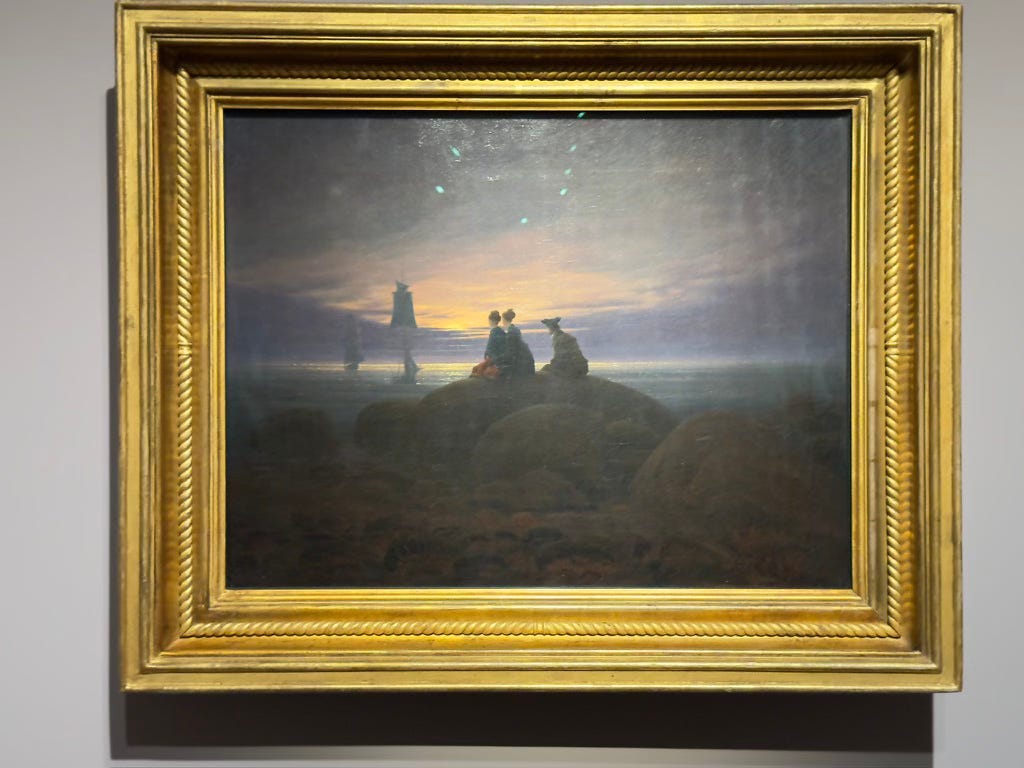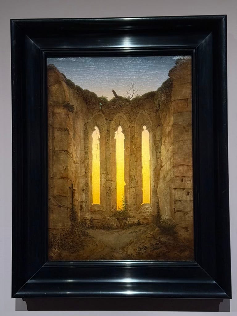 I'll start with Friedrich's fascination with light. Many of his paintings illustrate the power of lighting in an image (you'll have to excuse these images shot with my iPhone with unavoidable spotlight reflections).